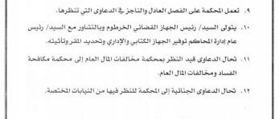 الخرطوم 28/3/2018م -- أصدر بروفيسور حيدر احمد دفع الله - رئيس القضاء اليوم قراراً بتأسيس محكمة جنايات تختص بمكافحة الفساد ومخالفات المال العام ونظر الدعاوى الخاصة بقضايا الفساد واستغلال النفوذ والتعدي على المال العام وتخريب الاقتصاد الوطني والتي تحال اليها من النيابات المتخصصة.