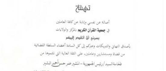 يزف الأمين العام لجمعية القران الكريم/أ.د/ عبدالرحمن محمد علي سعيد ـــ أصدق التهاني والتبريكات لرئيس القضاء بروفيسور/ حيدر أحمد دفع الله ، وعبره الى السادة أعضاء السلطة القضائية من قضاة ومستشارين وعاملين ، على الثقة الغالية التي نالوها من فخامة الرئيس المشير/ عمر حسن أحمد البشير - رئيس الجمهوري