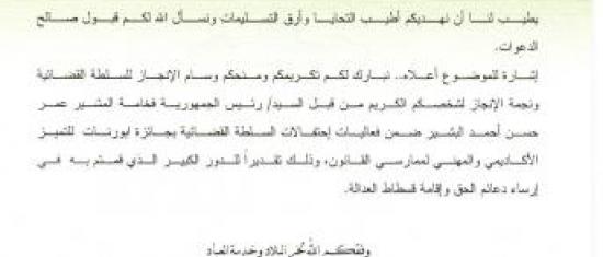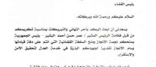 سعادة السيد/ رئيس جهاز أم درمان والسادة القضاة وجميع العاملين وشرطة المحاكم بجهاز امدرمان ، سعادة البروفيسور/ حيدر أحمد دفع الله - رئيس القضاء ، بنجمة الانجاز - ووسام الانجاز للسلطة القضائية ونيله ثقة رئيس الجمهورية المشير/ عمر حسن أحمد البشير ــ مع امنايته بدوام التوفيق والنجاح .