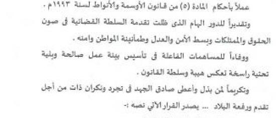 وتقديراً للدور الهام الذي ظلت تقدمة السلطة القضائية في صون الحقوق والممتلكات وبسط الأمن والعدل وطمأنينة المواطن وامنه .