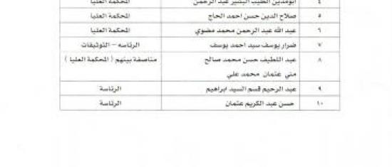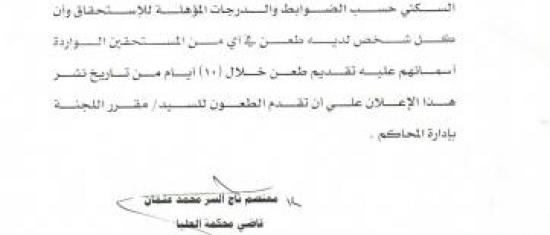 تعلن لجنة اسكان السادة القضاة والعاملين بأن الأسماء أدناه من القضاة والعاملين والشرطة القضائية هم المستحقون للقطع بمخطط المحورية والعدالة السكني حسب الضوابط والدرجات المؤهلة للاستحقاق وأن أي شخص لديه طعن في أي من المستحقين الواردة أسمائهم عليه تقديم طعن خلال (10) أيام من تاريخ نشر هذا الاعلان علي