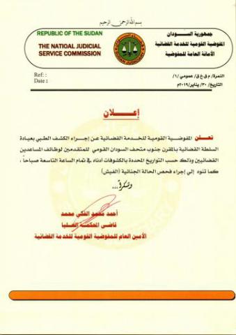 تعلن المفوضية القومية للخدمة القضائية عن إجراء الكشف الطبي بعيادة السلطة القضائية بالمقرن جنوب متحف السودان القومي للمتقدمين لوظائف المساعدين القضائيين وذلك حسب التواريخ المحددة بالكشوفات على الرابط أدناه في تمام الساعة التاسعة صباحاً ، كما ننوه إلى إجراء فحص الحالة الجنائية (الفيش) .