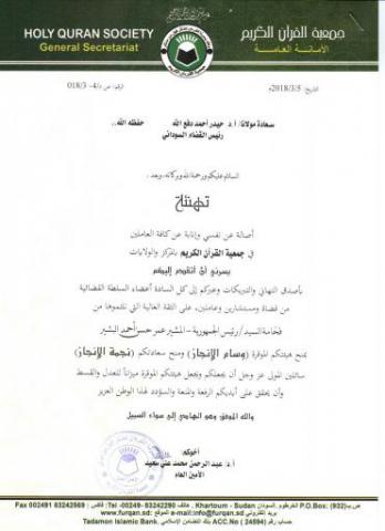 يزف الأمين العام لجمعية القران الكريم/أ.د/ عبدالرحمن محمد علي سعيد ـــ أصدق  التهاني والتبريكات لرئيس القضاء بروفيسور/ حيدر أحمد دفع الله ، وعبره الى السادة أعضاء السلطة القضائية من قضاة ومستشارين وعاملين ، على الثقة الغالية التي نالوها من فخامة الرئيس  المشير/ عمر حسن أحمد البشير - رئيس الجمهورية ، ومنحه نجمة الانجاز لرئيس القضاء ووسام الانجاز للسلطة القضائية