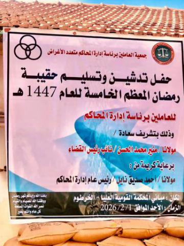 دشنت جمعية العاملين برئاسة إدارة المحاكم اليوم بمباني المحكمة القومية العليا الخرطوم تسليم حقيبة شهر رمضان المبارك للعام ١٤٤٧هجرية ، وذلك برعاية كريمة من رئيس عام إدارة المحاكم، وبحضور عدد لفيف من قضاة المحكمة القومية العليا وعدد من الموظفين والعاملين.