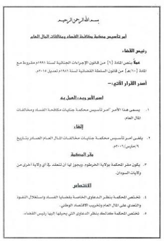 واشار القرار الى ان مقر المحكمة بولاية الخرطوم ويجوز لها ان تنعقد في اي ولاية اخرى من ولايات السودان على ان تشكل دوائر خاصة بمحكمة الاستئناف والمحكمة القومية العليا لنظر الاستئنافات و الطعون في الاحكام الصادرة من محكمة جنايات مكافحة الفساد ومخالفات المال العام.