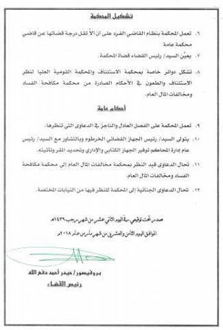 الخرطوم 28/3/2018م -- أصدر بروفيسور حيدر احمد دفع الله - رئيس القضاء اليوم قراراً بتأسيس محكمة جنايات تختص بمكافحة الفساد ومخالفات المال العام ونظر الدعاوى الخاصة بقضايا الفساد واستغلال النفوذ والتعدي على المال العام وتخريب الاقتصاد الوطني والتي تحال اليها من النيابات المتخصصة. كما تختص المحكمة كذلك بنظر الدعاوى التي يحيلها اليها رئيس القضاء.