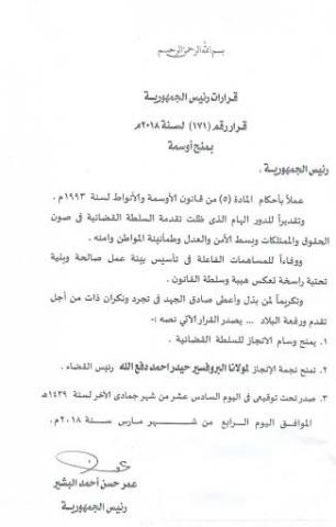 وتقديراً للدور الهام الذي ظلت تقدمة السلطة القضائية في صون الحقوق والممتلكات وبسط الأمن والعدل وطمأنينة المواطن وامنه .